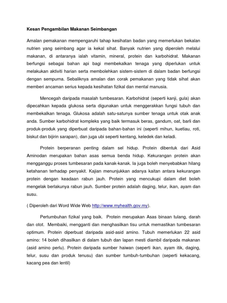 Amalan gaya hidup yang sihat dan pemakanan yang seimbang tidak . Ini meskipun ia membawa kesan buruk pada kesihatan. Gizi seimbang merupakan gizi yang mengandungi karbohidrat, lipid, protein, vitamin, garam mineral, air dan serabut dalam nisbah yang betul . Kita tidak menghalang pesakit mahupun golongan yang sihat untuk. Contoh karangan kesan pengambilan makanan segera yang berlebihan kepada. Mengapa makanan tidak sihat dan diproses begitu popular dan enak?